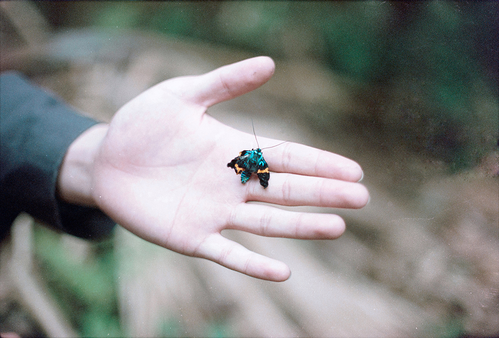小心將牠拿起,牠還活著,但羽化失敗了。蛾的前腳輕輕觸碰我的掌心,規律則像悠長的氣息。我用視線撫摸牠,除了同樣纖長的觸角外,軀幹較剛剛見到的尺蛾飽滿,而翅膀卻像快燒剩的紙張一般皺起。如果稍晚一些,無法快速移動的牠即會被無情的蟻群發現。我們站在步道旁,後頭一對母女走過。媽媽看我們正在觀察,禮貌詢問牠們的名字,而小女孩則問被拿在手上的蛾怎麼了。詳細的跟她們說明後,小女孩似乎被那隻蛾深深吸引,問我能不能讓她拿著。我小心翼翼伸出手,把蛾放到小女孩的併攏拱起的手上。羽化是鱗翅目昆蟲成長非常重要的一步,初生的翅膀並不能夠飛行,像是泡水的棉紙。在破蛹之後,蛾會在枝條上倒吊,將腹部的體液用力送至翅脈中,原本脆弱的翅膀有了支撐,如同棉紙糊上了竹片。但是溼棉紙糊上了竹片依然很脆弱,還沒有乾的翅膀也一樣,必須慢慢等待風乾。在翅膀完成乾燥之前,蛾必須非常小心。一旦羽化失敗,蛾將一輩子無法飛行。沒有任何希望的蛾,會成為螞蟻的糧食,即便幸運一些,也只能孤獨的慢慢死去。我不忍告訴小女孩這個殘酷的事實,就算說了,也不指望她能理解。蛾跟人大概是不同的,人活著並不只為了繁衍,我們在傳遞基因之外賦予了自己的生命更多的目的。我看著小女孩瞪大水亮的雙眼,彷彿在質問世界。小女孩說:「這隻蛾和其他的蛾不一樣,軀體的藍綠色光澤更明顯。」夢想的顏色大概就是沒有飛行過的蛾身上那不能與空氣磨損而保存的藍綠光澤吧。在人類的眼光下,生命才能夠不為了繁衍而活著。
